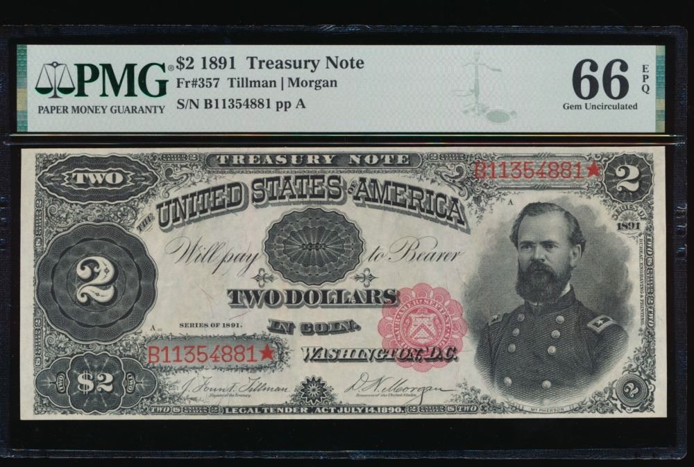 One 1891 $2 Treasury Note PMG 66EPQ.