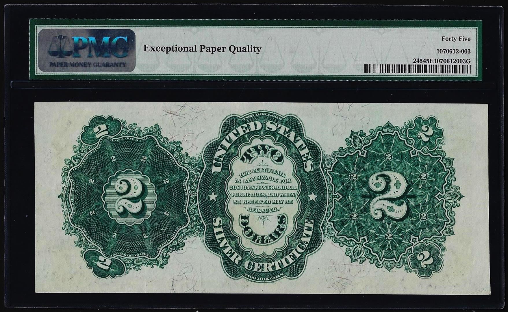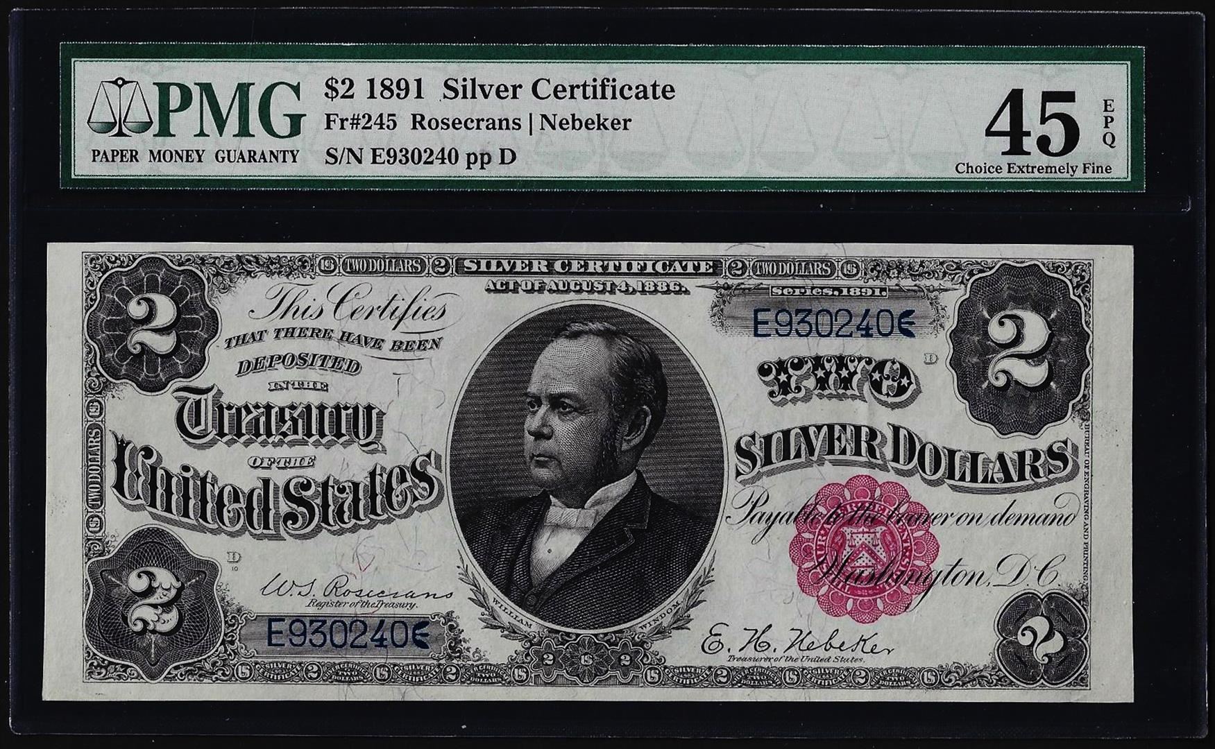 One 1891 $2 Windom Silver Certificate Note Fr.245 PMG Extremely Fine 45EPQ. PMG Certified.