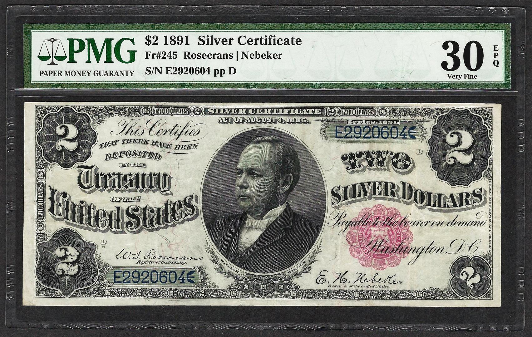 One 1891 $2 Windom Silver Certificate Note Fr.245 PMG Very Fine 30EPQ. PMG Certified.