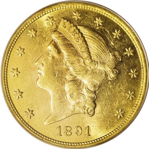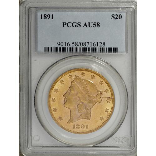 <B>1891 $20 AU58 PCGS.</B></I> The 1891 was underappreciated by numismatists as a rare issue in the Liberty Head double eagle series, until recently; yet probably fewer than 100 pieces survive from a low mintage of 1,390 business strikes. This near-Mint example is well struck with prooflike fields and rich reddish-gold and green coloration. Little or no highpoint wear exists on either side, but numerous wispy marks are noted in the fields. Similar to the NGC AU58 Prooflike that sold for $69,000 in our 2006 August Denver Signature. In our experience, it is very difficult to locate an 1891 in AU, and a mere four pieces have been certified in Mint State by the two major services: three by NGC and one at PCGS. The highest-graded of these is an MS62, at NGC. Population: 9 in 58, 1 finer (11/06).<BR><BR><b>Shipping:</b> Coin/Currency (<a target="_blank" href="http://www.heritageauctions.com/common/shipping.php">view shipping information</a>)