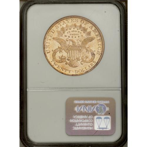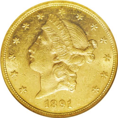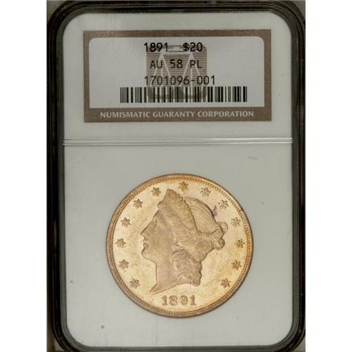 <B>1891<$20> AU58 Prooflike NGC.</B></I> Extensively abraded but seemingly free of highpoint wear, this dynamically reflective example displays rich reddish-golden color with lime-green undertones. The striking details on the coin are excellent. According to Michael Fuljenz and Douglas Winter (2000): "The 1891 Double Eagle is very rare in all grades. It is generally found in Extremely Fine or in the lower ranges of About Uncirculated. It becomes very rare in the higher About Uncirculated grades and extremely rare in Mint State." Obviously, with the Prooflike designation as a part of its grade assessment, the issue is even more rare, as evidenced by the NGC Census report of: 1 in 58 Prooflike, 1 finer (7/06).<BR><I>From The New York Eye Appeal Collection.</B></I>