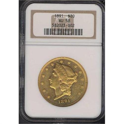 <b>1891 $20 Liberty. NGC graded AU58.</b> 1,441 minted. A few light marks on the rims, on the face and lower neck, and in the prooflike field by the date. A still-original beauty of this very rare, low mintage date.