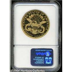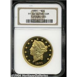 <B>1891<$20> PR66 Deep Cameo NGC.</B></I> The 1891 Double Eagle was struck in a year when the vast majority of large gold coin production was earmarked for the San Francisco facility, certainly a practical policy since nearly all newly mined gold ore originated in the Pacific West. As a result, only 1,390 business strikes were produced along with 52 proofs. Both are predictably elusive today, with the tiny quantity of business strikes almost always seen with some degree of circulation and fewer than half of the proof mintage believed to be extant.<BR> The surfaces on this spectacular proof Double Eagle display the slightest haziness over fields of uncanny depth of mirrored reflectivity, while the central features are heavily frosted, and the resultant contrast is extreme. Solid Condition Census quality on this difficult and sought-after proof Double Eagle issue. Population: 3 in 66, 1 finer (4/04).<BR><I>From The Greenwich Collection, Part One.</B></I> <BR><BR><B>Important notice:</B> Heritage usually auctions material at the rate of 200-250 lots per hour. On some occasions eBay Live bid software or the Internet may not be able to keep up with the pace of the auction. We recommend placing a realistic absentee bid now as insurance to avoid disappointment. Occasionally the auctioneer may eliminate or reject an eBay Live bid, and the auctioneer may also reopen a lot after the close of the eBay live bidding (usually because we missed an audience bid), and may reject your bid even if it shows you as the winning bidder. By bidding via eBay Live, you agree that Heritage may award the lot to another bidder at its sole discretion under the circumstances described above or any other reasonable circumstances. Since eBay bids are not shown to us until we open the lot on the floor, we treat those bids just like floor bids. In most cases the floor responds before the eBay bid is presented to us, due to Internet lag time, so for consistency we have made it a policy that floor bids are always considered first over tie eBay live bids. Also please note that all Heritage lots purchased through eBay Live carry a 20% Buyer's Premium. Please make sure you read the Terms and Conditions before you bid.