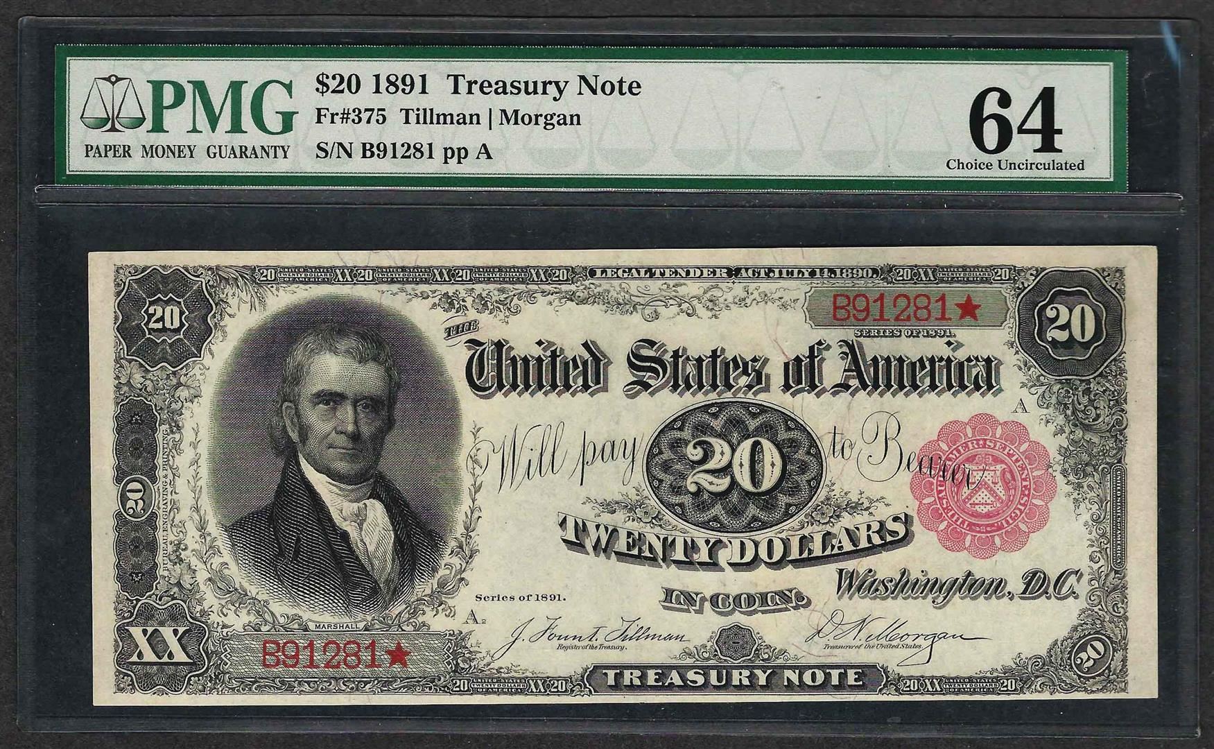 One 1891 $20 Treasury Note Fr.375 PMG Choice Uncirculated 64. PMG Certified.