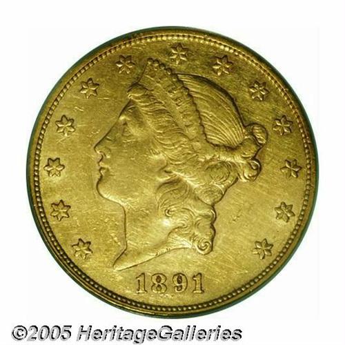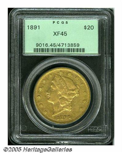<B>1891<$20> XF45 PCGS.</B></I> This elusive P-mint is one of just 1,442 pieces struck. Only about 15 pieces are estimated to be extant in XF, with maybe 15 or 16 pieces grading higher. This Choice XF specimen displays deep gold-orange patina with light green accents on the obverse, and lighter shades on the reverse. Good definition is seen on the design elements, though portions of Liberty's hair are soft. A few light to moderate contact marks are scattered about the obverse. Population: 1 in 45, 28 finer (4/05).