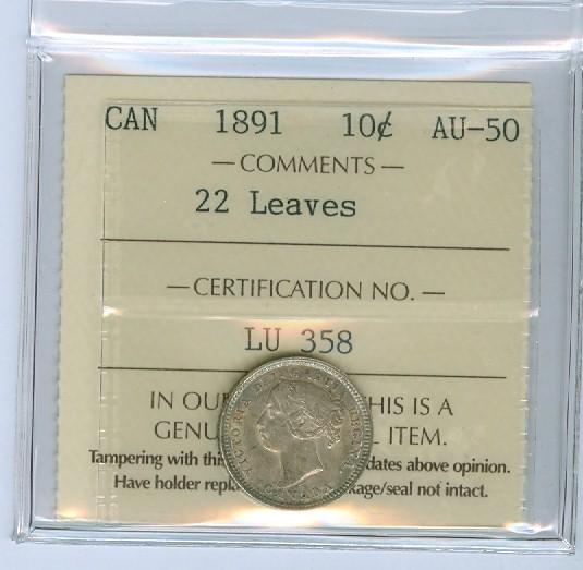 1891 22 Leaves 10¢ ICCS AU50 Attractive but light toning