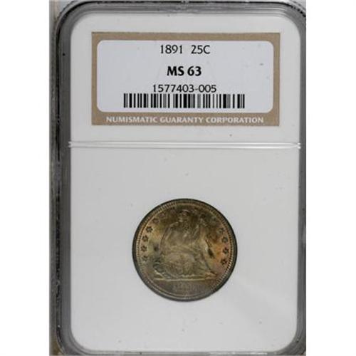 <B>1891 25C MS63 NGC.</B></I> NGC Census: (98/212). PCGS Population (122/212). Mintage: 3,920,600. Numismedia Wsl. Price for NGC/PCGS coin in MS63: $442. (#5524)<BR><BR><B>Coin Engraver:</B> Christian Gobrecht<BR><BR><b>Shipping:</b> Coins & Currency (<a target="_blank" href="http://www.heritageauctions.com/common/shipping.php">view shipping information</a>)