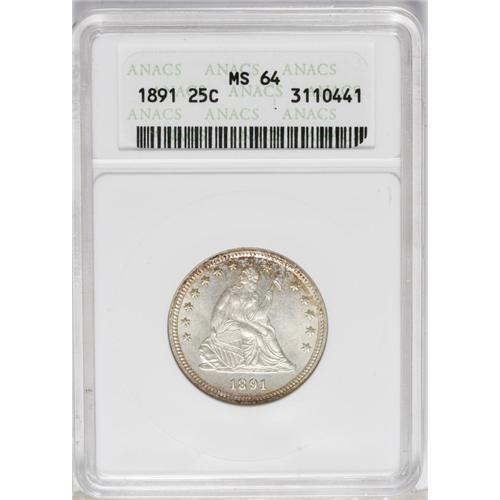 <B>1891<25C> MS64 ANACS.</B></I> A near-Gem from the last year of issue, this piece is sharply struck and mostly untoned with champagne at the rims and thicker russet from 10 to 1 o'clock on the obverse with correspondence on the reverse. Somewhat reflective and wholly appealing.