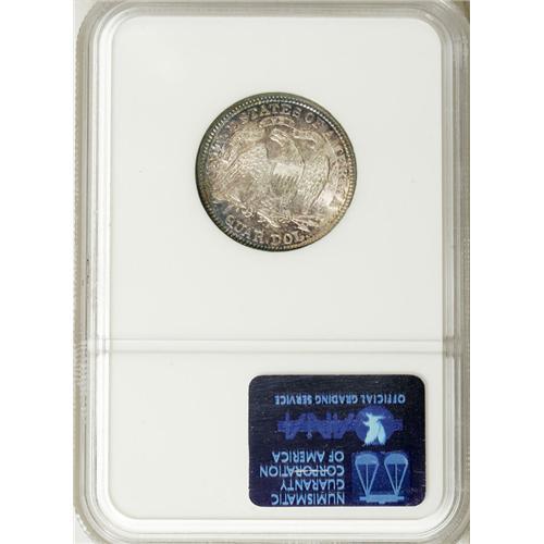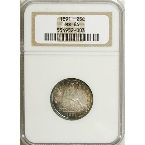 <B>1891 25C MS64 NGC.</B></I> A lavish display of peripheral plum, lime-green, and cobalt-blue toning occurs on each side of this highly lustrous near-Gem. The design elements are crisply struck, except for the right side obverse stars. A couple of tiny marks are noted on Liberty's jaw. Faint die clash marks are observed on the obverse.<BR><BR><b>Shipping:</b> Coins & Currency (<a target="_blank" href="http://www.heritageauctions.com/common/shipping.php">view shipping information</a>)