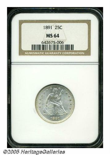<B>1891<25C> MS64 NGC.</B></I> Lustrous surfaces are virtually snow-white, displaying just a few freckles of gray patina here and there. The reverse is crisply struck, while the star centers and Liberty's foot are weak. A few insignificant marks are scattered over the obverse. NGC has certified 81 pieces higher (5/05).