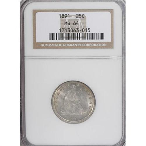 <B>1891 25C MS64 NGC.</B></I> Glowing luster exudes from well preserved surfaces lightly toned in gold-tan. A well executed strike brings out excellent definition in the design elements. This is an important attribute of this near-Gem example, because this issue is usually poorly struck! (Larry Briggs, 1991).<BR><BR><b>Shipping:</b> Coins & Currency (<a target="_blank" href="http://www.heritageauctions.com/common/shipping.php">view shipping information</a>)