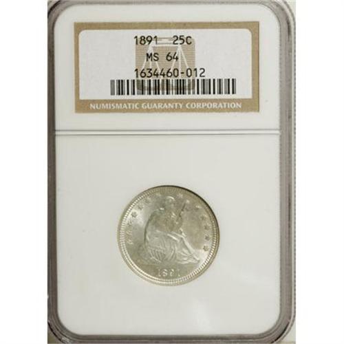 <B>1891 25C MS64 NGC.</B></I> A Choice Mint State piece, this quarter has frosty white-silver surfaces with brilliant luster and only a faint trace of toning. The final year of issue, this date is relatively common in most grades.<BR><BR><b>Shipping:</b> Coins & Currency (<a target="_blank" href="http://www.heritageauctions.com/common/shipping.php">view shipping information</a>)