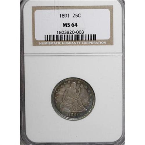 <B>1891 25C MS64 NGC.</B></I> Soft, swirling luster enlivens the richly toned surfaces of this well struck near-Gem. Gold-orange and peach-rose toning prevails over the centers, while the margins show softer azure patina.<BR><BR><B>Coin Engraver:</B> Christian Gobrecht<BR><BR><b>Shipping:</b> Coins & Currency (<a target="_blank" href="http://www.heritageauctions.com/common/shipping.php">view shipping information</a>)