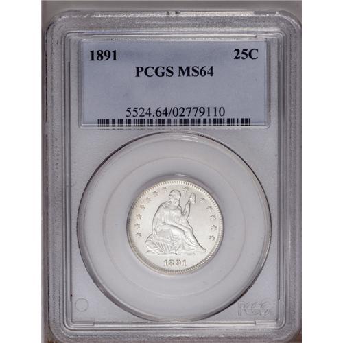 <B>1891<25C> MS64 PCGS.</B></I> Boldly defined except for the obverse stars and the top of Liberty's head, with untoned silver-white surfaces that display a pleasing frosty sheen. Die clash marks are evident on each side of the coin, but abrasions or luster grazes are mercifully absent. Population: 119 in 64, 72 finer (1/06).