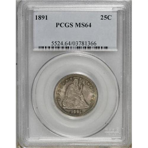 <B>1891 25C MS64 PCGS.</B></I> PCGS Population (139/79). NGC Census: (124/88). Mintage: 3,920,600. Numismedia Wsl. Price for NGC/PCGS coin in MS64: $725. (#5524)<BR><BR><B>Coin Engraver:</B> Christian Gobrecht<BR><BR><b>Shipping:</b> Coins & Currency (<a target="_blank" href="http://www.heritageauctions.com/common/shipping.php">view shipping information</a>)