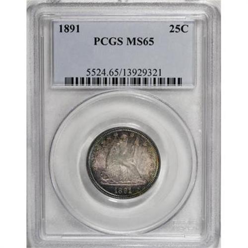 <B>1891 25C MS65 PCGS.</B></I> A well struck Gem representative of this desirable final-year issue, one that offers vibrant luster and lovely blue and violet toning. Both sides offer excellent eye appeal, though the reverse is a touch livelier. Population: 54 in 65, 23 finer (8/07).<BR><BR><B>Coin Engraver:</B> Christian Gobrecht<BR><BR><b>Shipping:</b> Coins & Currency (<a target="_blank" href="http://www.heritageauctions.com/common/shipping.php">view shipping information</a>)