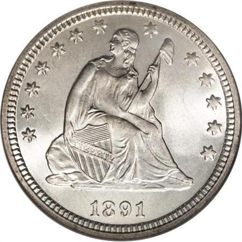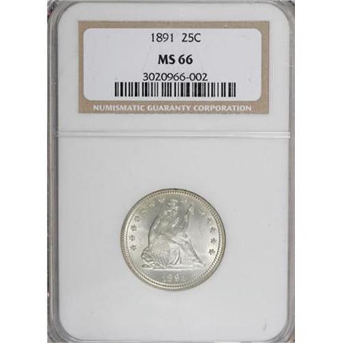 <B>1891 25C MS66 NGC.</B></I> This beautiful Premium Gem displays frosty luster on color-free surfaces. A well directed strike brings out better than usually seen definition on the design elements, except for minor softness on the stars along the right border. Both sides are impeccably preserved. Census: 24 in 66, 12 finer (12/07).<BR><BR><B>Coin Engraver:</B> Christian Gobrecht<BR><BR><b>Shipping:</b> Coins & Currency (<a target="_blank" href="http://www.heritageauctions.com/common/shipping.php">view shipping information</a>)
