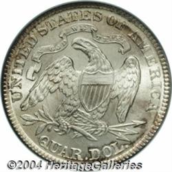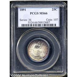 <B>1891<25C> MS66 PCGS.</B></I> Boldly struck, if slightly weak on the obverse peripheral stars, with heavy die clash marks (as struck) on both obverse and reverse. Rich satiny luster gleams from the well preserved surfaces, while vivid lilac and dark-green toning adorns the obverse peripheries, and slight golden-brown patina decorates the peripheries on the reverse. A premium example of this final year of the long-lived Seated Liberty design. Population: 14 in 66, 2 finer (3/04).<BR><I>From the JFS Collection.</B></I> <BR><BR><B>Important notice:</B> Heritage usually auctions material at the rate of 200-250 lots per hour. On some occasions eBay Live bid software or the Internet may not be able to keep up with the pace of the auction. We recommend placing a realistic absentee bid now as insurance to avoid disappointment. Occasionally the auctioneer may eliminate or reject an eBay Live bid, and the auctioneer may also reopen a lot after the close of the eBay live bidding (usually because we missed an audience bid), and may reject your bid even if it shows you as the winning bidder. By bidding via eBay Live, you agree that Heritage may award the lot to another bidder at its sole discretion under the circumstances described above or any other reasonable circumstances. Since eBay bids are not shown to us until we open the lot on the floor, we treat those bids just like floor bids. In most cases the floor responds before the eBay bid is presented to us, due to Internet lag time, so for consistency we have made it a policy that floor bids are always considered first over tie eBay live bids. Also please note that all Heritage lots purchased through eBay Live carry a 20% Buyer's Premium. Please make sure you read the Terms and Conditions before you bid. </span></font></tr></table></td></tr></table>