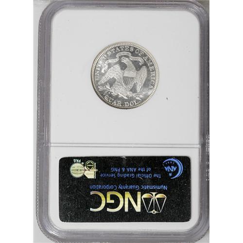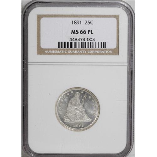 <B>1891<25C> MS66 Prooflike NGC.</B></I> An alluring and brilliant piece with lightly frosted devices and deep mirrors. A couple small dark spots and small patches of hazy toning offer little distraction. Census: 2 in 66 Prooflike, 0 higher (7/06).