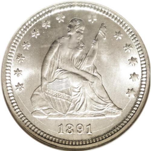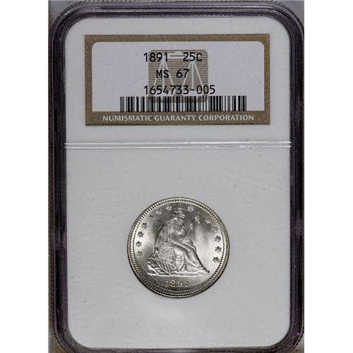 <B>1891<25C> MS67 NGC.</B></I> An almost perfect example of this final year Seated quarter issue. Both sides are satiny with a snow-white, completely untoned appearance that only adds to the character and appeal of the impeccable surfaces. A little minor softness of strike is noted on some of the obverse peripheral stars. Census: 10 in 67, 1 finer (7/06).
