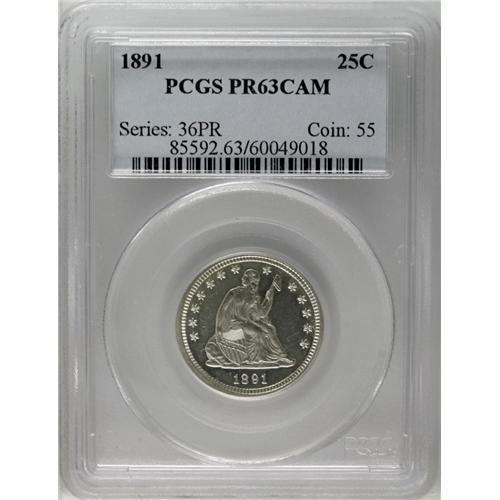 <B>1891<25C> PR63 Cameo PCGS.</B></I> Light gray patina covers both sides, but does not dim the bright fields nor the frosty devices, and so the cameo effect is a standout. Light hairlines and a small fingerprint fragment on the obverse limit the grade.