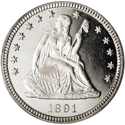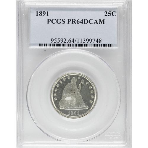 <B>1891 25C PR64 Deep Cameo PCGS.</B></I> The 1891 quarter saw 600 proofs made, a goodly number of which have apparently survived to the present day, at least according to the PCGS and NGC population/census data. Deep/Ultra Cameos are an entirely different story, as the two services have seen a mere 12 pieces, to date. This near-Gem exhibits frosty, well struck motifs that appear to glide over deep watery fields. A few minor handling marks do not disturb. Population: 3 in 64 Deep Cameo, 6 finer (4/07).<BR><BR><b>Shipping:</b> Coins & Currency (<a target="_blank" href="http://www.heritageauctions.com/common/shipping.php">view shipping information</a>)