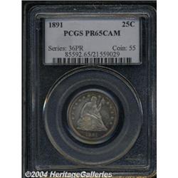 <B>1891<25C> PR65 Cameo PCGS.</B></I> Lovely sunset-orange and rose toning gradually lightens toward the centers. Even through the coloration, the major designs elements are noticeably frosted. Population: 5 in 65 Cameo, 2 finer (4/04). <BR><BR><B>Important notice:</B> Heritage usually auctions material at the rate of 200-250 lots per hour. On some occasions eBay Live bid software or the Internet may not be able to keep up with the pace of the auction. We recommend placing a realistic absentee bid now as insurance to avoid disappointment. Occasionally the auctioneer may eliminate or reject an eBay Live bid, and the auctioneer may also reopen a lot after the close of the eBay live bidding (usually because we missed an audience bid), and may reject your bid even if it shows you as the winning bidder. By bidding via eBay Live, you agree that Heritage may award the lot to another bidder at its sole discretion under the circumstances described above or any other reasonable circumstances. Since eBay bids are not shown to us until we open the lot on the floor, we treat those bids just like floor bids. In most cases the floor responds before the eBay bid is presented to us, due to Internet lag time, so for consistency we have made it a policy that floor bids are always considered first over tie eBay live bids. Also please note that all Heritage lots purchased through eBay Live carry a 20% Buyer's Premium. Please make sure you read the Terms and Conditions before you bid.
