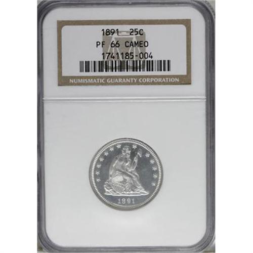 <B>1891 25C PR66 Cameo NGC.</B></I> This is a fully brilliant Gem proof with exceptional cameo contrast. The devices on both sides are fully lustrous with frosty texture, surrounded by deeply mirrored fields. Considered separately, the reverse appears to exhibit Deep Cameo contrast. Census: 17 in 66 Cameo, 10 finer (11/07). <BR><BR><b>Shipping:</b> Coins & Currency (<a target="_blank" href="http://www.heritageauctions.com/common/shipping.php">view shipping information</a>)