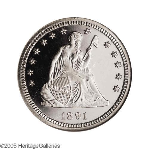 <B>1891<25C> PR67 Cameo NGC.</B></I> Only 600 proofs were struck of the 1891 quarter, the final year of the Seated Liberty design. Quarters of this date are generally well produced and show a high degree of eye appeal. This particular coin certainly does with its brilliant overall surfaces and illimitable depth of mirrored reflectivity in the fields. The design elements are quite heavily frosted and establish a stark contrast on each side. Population: 7 in 67, 1 finer (10/05).