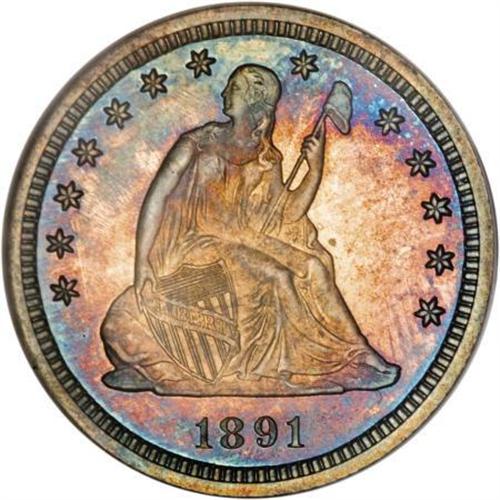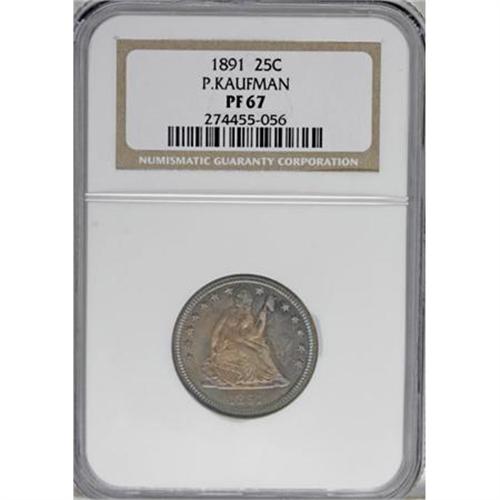 <B>1891 25C PR67 NGC.</B></I> Ex: P. Kaufman. Briggs 1-A. This coin is far better struck than often seen for examples of this final-year proof delivery. The obverse stars are all crisp with full centrils, and the letters in the reverse legend do not reveal any evidence of die crumbling. More or less even cobalt-blue rim accents frame richly toned, reddish-copper centers. The central obverse is lighter than that on the reverse with more of an apricot-orange appearance. The fields shimmer with modest, yet appreciable reflectivity as the coin rotates under a lamp, and neither side reveals a single distracting blemish. Perfect for Superb Gem type purposes. Census: 13 in 67, 3 finer (12/07). <BR><BR><B>Coin Engraver:</B> Christian Gobrecht<BR><BR><b>Shipping:</b> Coins & Currency (<a target="_blank" href="http://www.heritageauctions.com/common/shipping.php">view shipping information</a>)
