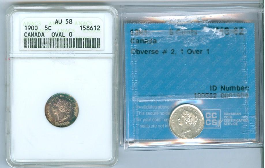 1891 5¢ CCCS MS62 1/1 Obv 2 & 1900 Oval 0 ANACS AU58. Lot of 2 coins.
