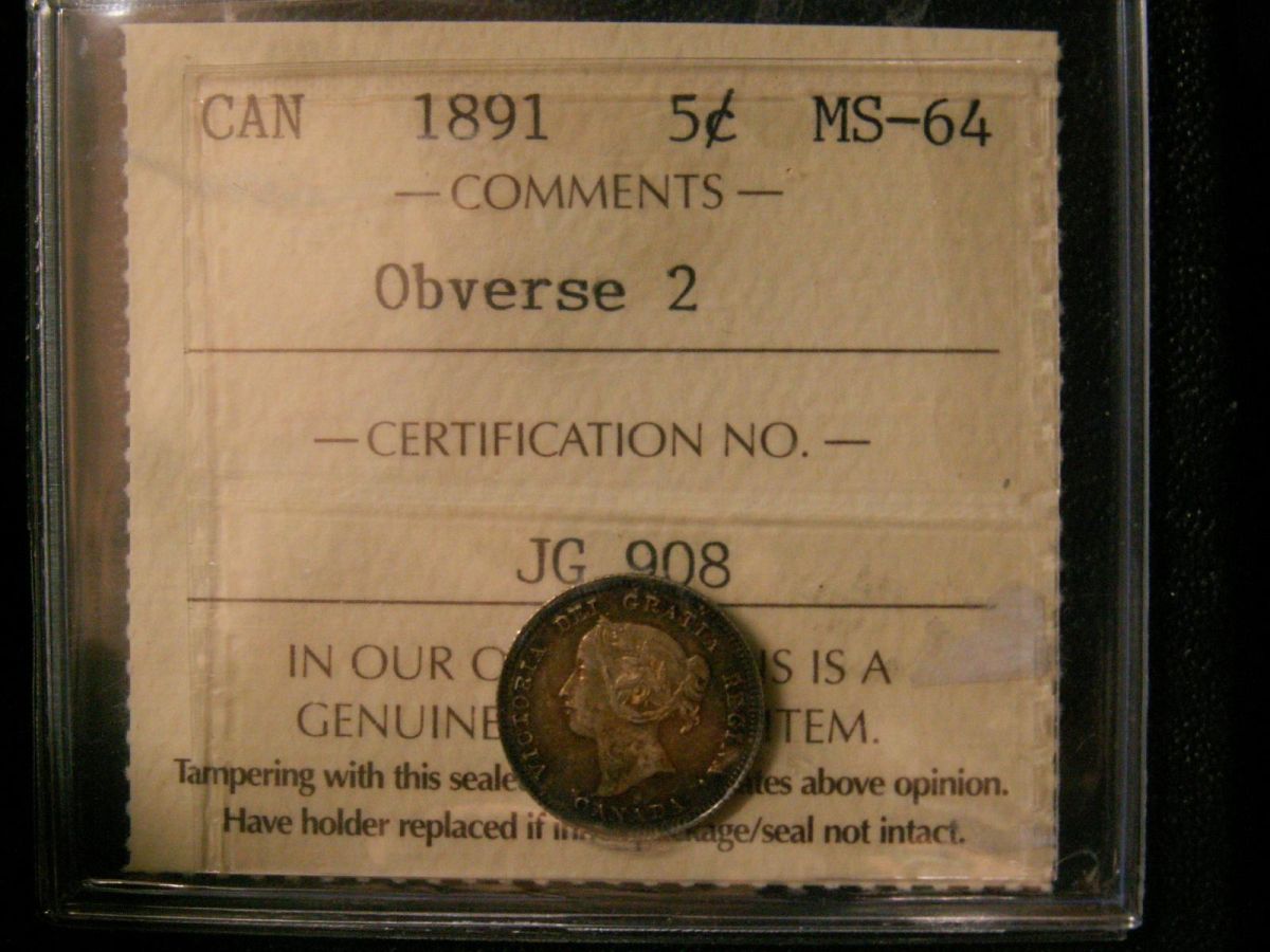1891 5¢ ICCS Obv 2 ICCS MS64. Golden to brown shades.