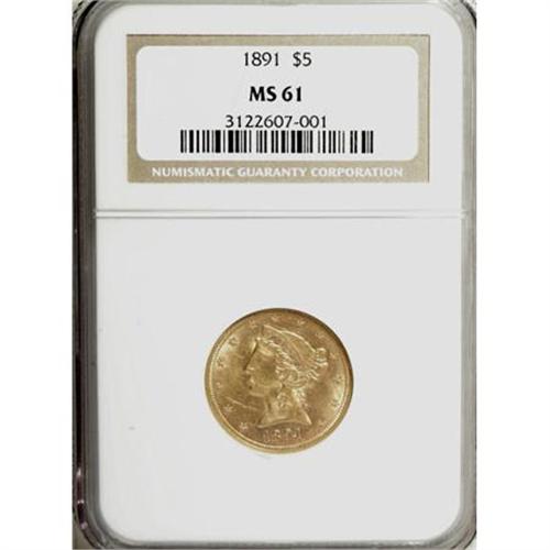<B>1891 $5 MS61 NGC.</B></I> NGC Census: (80/116). PCGS Population (28/98). Mintage: 61,300. Numismedia Wsl. Price for NGC/PCGS coin in MS61: $360. (#8377)<BR><BR><B>Coin Engraver:</B> Christian Gobrecht<BR><BR><b>Shipping:</b> Coins & Currency (<a target="_blank" href="http://www.heritageauctions.com/common/shipping.php">view shipping information</a>)