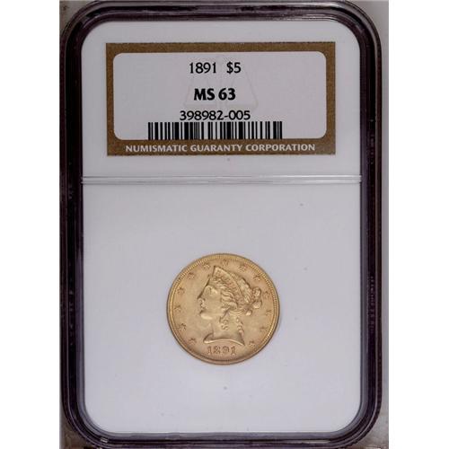 <B>1891 $5 MS63 NGC.</B></I> A well struck coin with good luster and fairly clean surfaces. A few small marks are concentrated on the obverse that limit the grade. Struck from clashed dies, an elusive lower mintage issue.