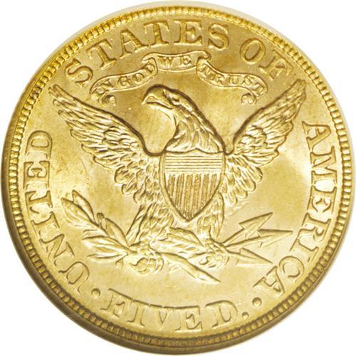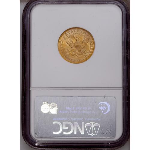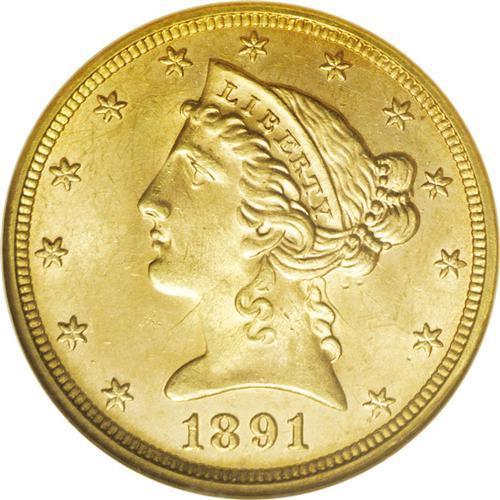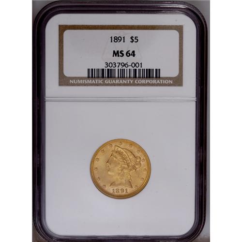 <B>1891 $5 MS64 NGC.</B></I> The certified population of this P-mint half eagle drops off rapidly as one approaches the Gem grade level. A just-miss example, the surfaces are still uncommonly clean for the issue. The golden-rose color accents the unimpaired luster quality. Powerfully impressed with fully defined features, a thin pinscratch is noted across Liberty's neck into the obverse field. Census: 12 in 64, 1 finer (1/06).