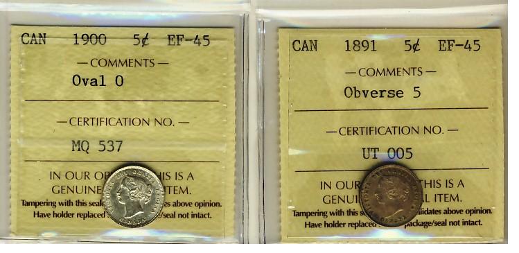 1891 5¢ Obv 5 & 1900 Oval ICCS EF45. Lot of 2 coins.