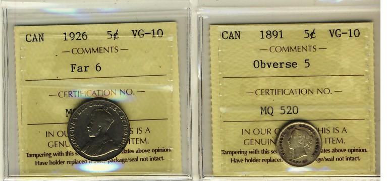 1891 5¢ Obv 5, 1926 Far ICCS VG10. Lot of 2 coins.