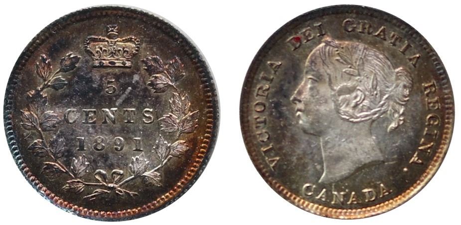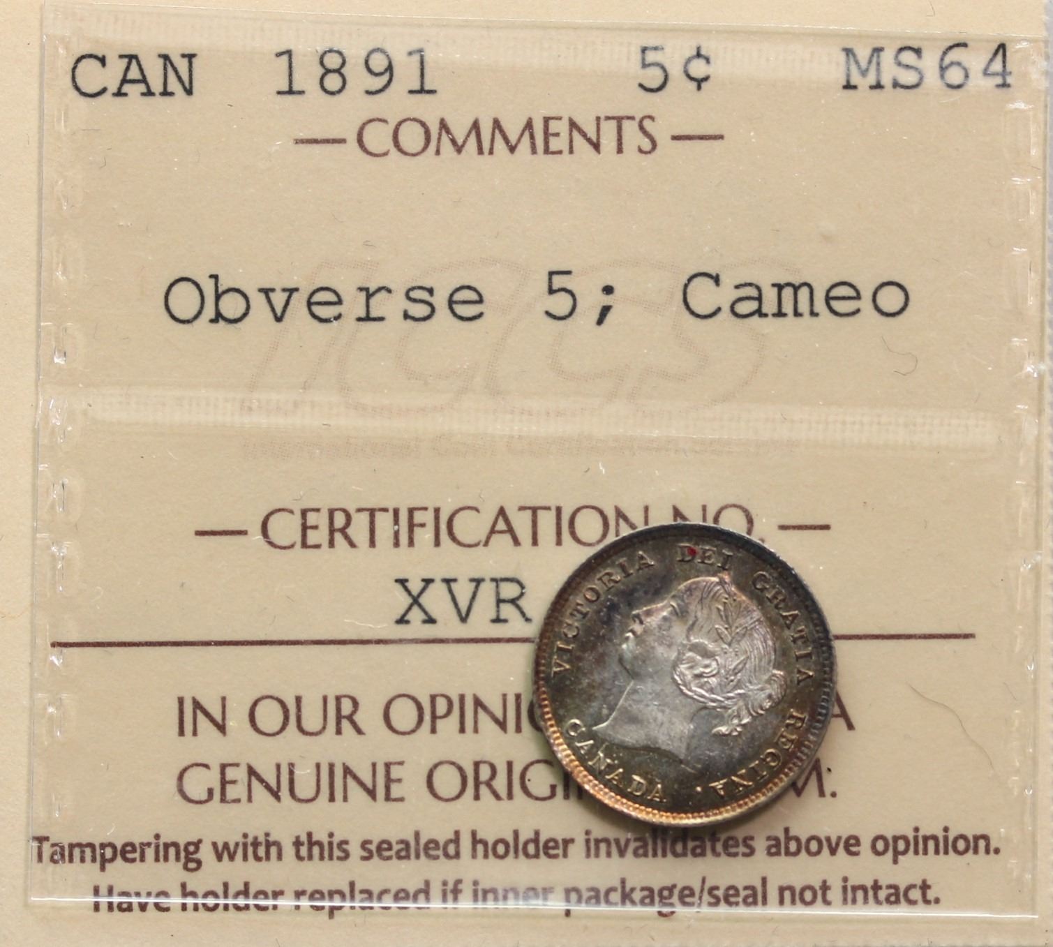 1891 5¢ "Obv.5 ICCS Choice Mint State-64 Cameo. Razor sharp details with mild glow of gold and russet tones.