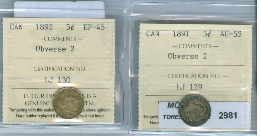 1891 5¢ Obv. port. #2. ICCS AU-55; 1892. Obv. port. #2. ICCS EF-45. Lot of two (2) pcs., both with medium to heavy toning.