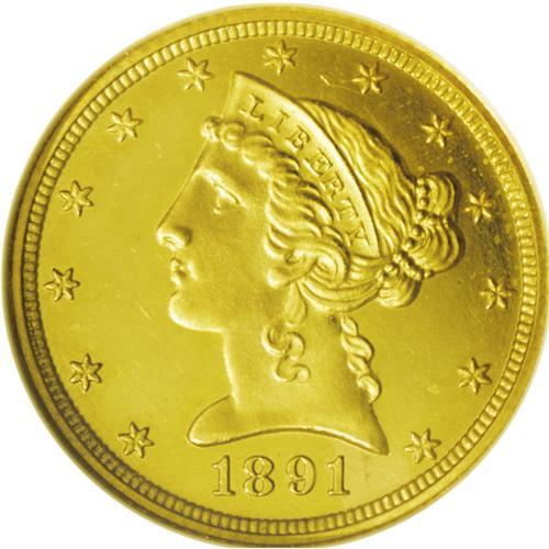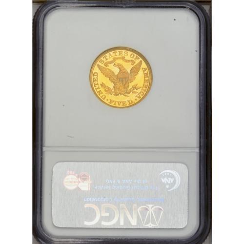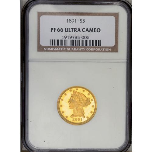 <B>1891<$5> PR66 Deep Cameo NGC.</B></I> The mintage of half eagles at the Philadelphia Mint was limited to just 61,360 business strikes and 53 proofs in 1891. High quality survivors in either format are rare. This example, a glorious Cameo proof is one of the finest. Walter Breen identified examples with attenuated tail feathers above the branch as proof coins, although business strikes are also known from the same reverse die. One such example is lot 1256 in the October 1999 sale of the Bass Collection. Regarding proofs of this date, it is the consensus of most numismatists that only about 25 to 30 examples still exist, and most of these are in lower grades.<BR> The example that is now offered is clearly and obviously a proof strike, with extraordinary design details, deeply mirrored fields, lustrous devices, and exceptional contrast. The fields exhibit a slight orange-peel effect that is characteristic of proof coins from this era. Although close inspection reveals a few faint hairlines, there are no significant surface marks on either side. The color is deep yellow-gold with faint greenish tendencies. A small lint mark in the left reverse field, just above the branch, is shaped like a backward question mark, and positively identifies this example as the Pittman Collection specimen. This glittering proof is a coin that will be appreciated by the connoisseur of proof gold coinage.<BR><I>Ex: Dr. Charles Green Collection sale (B. Max Mehl, 4/1949), lot 319; John Jay Pittman Collection (David Akers, 10/1997), lot 1052.</B></I>