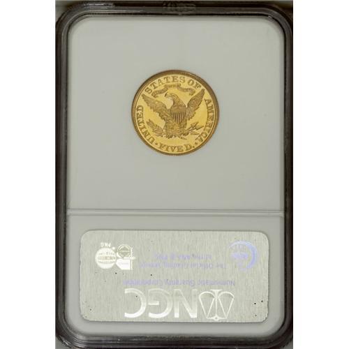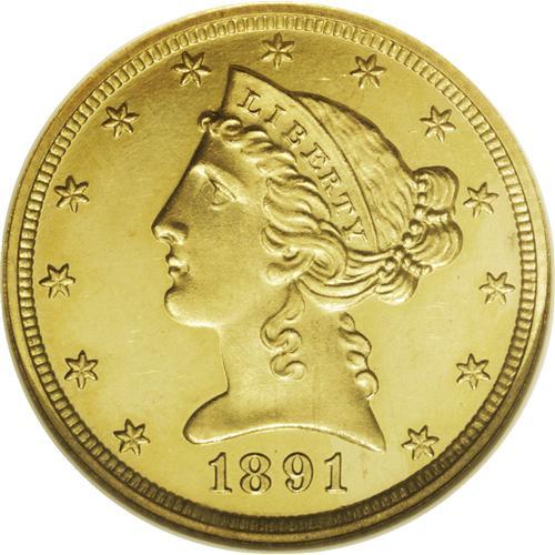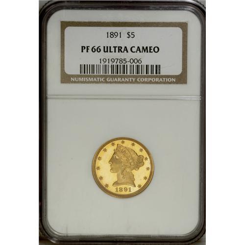 <B>1891 $5 PR66 Ultra Cameo NGC.</B></I> The mintage of half eagles at the Philadelphia Mint was limited to just 61,360 business strikes and 53 proofs in 1891. High quality survivors in either format are rare. This example, a glorious Cameo proof is one of the finest. Walter Breen identified examples with attenuated tail feathers above the branch as proof coins, although business strikes are also known from the same reverse die. One such example is lot 1256 in the October 1999 sale of the Bass Collection. Regarding proofs of this date, it is the consensus of most numismatists that only about 25 to 30 examples still exist, and most of these are in lower grades. In fact, the number of proof survivors may actually be smaller, based on past appearances in Heritage sales and offerings of other firms. The Bass, Eliasberg, Pittman, Garrett, and Norweb Collections each had an example, and two are held in the Smithsonian Institution. Ed Trompeter's came from Norweb, and few other auction appearances are noted over many years.<BR> The example that is now offered is clearly and obviously a proof striking, with extraordinary design details, deeply mirrored fields, lustrous devices, and exceptional contrast. The fields exhibit a slight orange-peel effect that is characteristic of proof coins from this era. Although close inspection reveals a few faint hairlines, there are no significant surface marks on either side. The color is deep yellow-gold with faint greenish tendencies. A small lint mark in the left reverse field, just above the branch, is shaped like a backward question mark, and positively identifies this example as the Pittman Collection specimen. This glittering proof is a coin that will be appreciated by the connoisseur of proof gold coinage.<BR><I>Ex: Dr. Charles Green Collection sale (B. Max Mehl, 4/1949), lot 319; John Jay Pittman Collection (David Akers, 10/1997), lot 1052.</B></I><BR><BR><b>Shipping:</b> Coin/Currency (<a target="_blank" href="http://www.heritageauctions.com/common/shipping.php">view shipping information</a>)