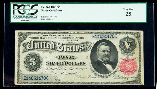 1891, $5 Silver Certificate. PCGS Very Fine 25. . Fr-267. A very attractive mid-grade example of this scarcer note, with bold inks and bright colors that have not dimmed over the years and through the channels of commerce. The paper is an even cream color with no mentionable flaws.