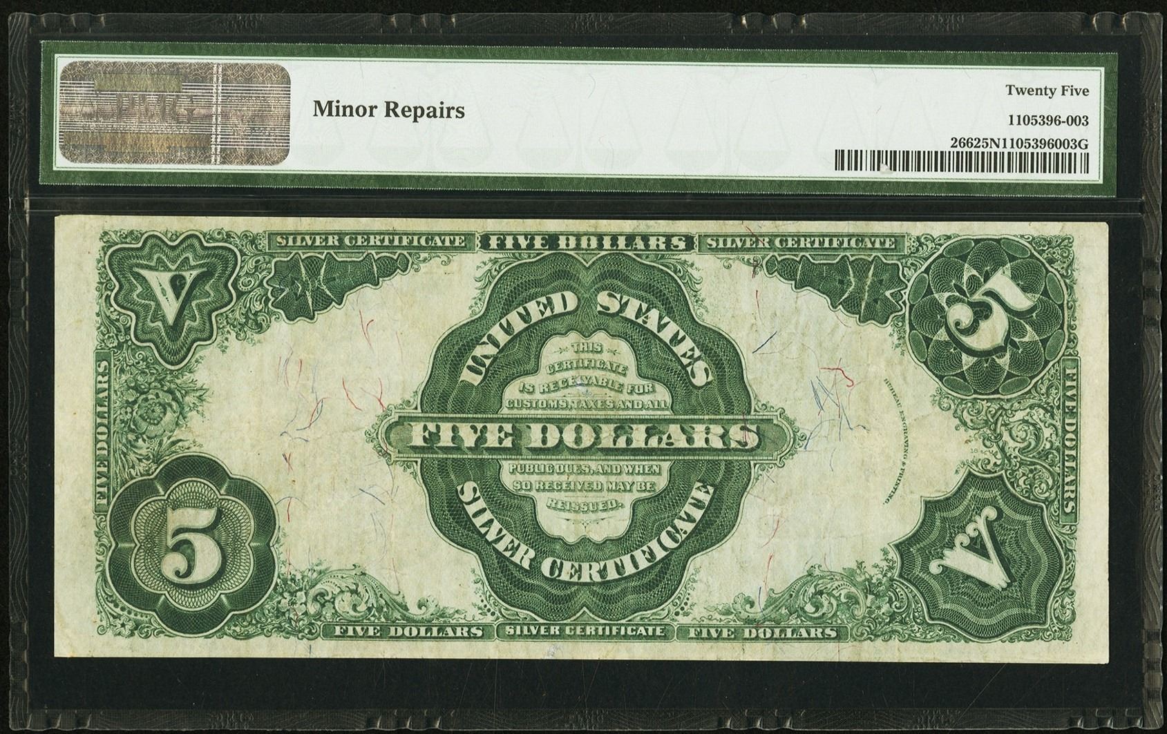 One 1891 $5 Silver Certificate PMG 25NET.