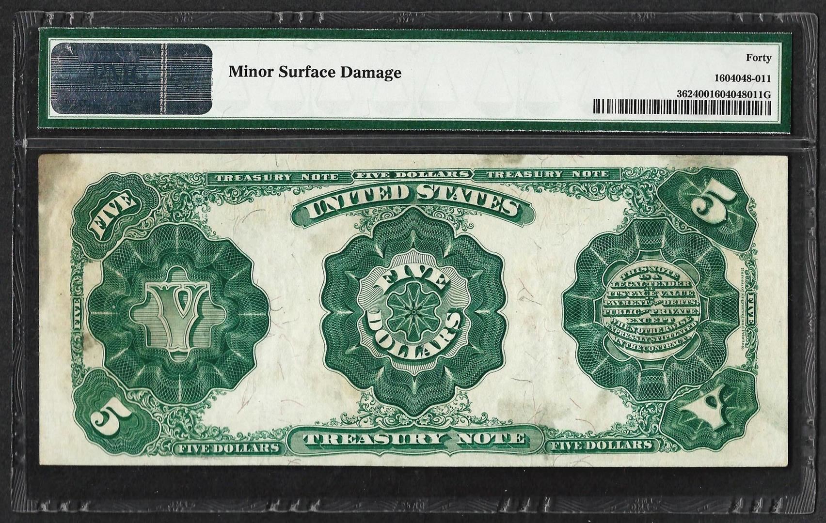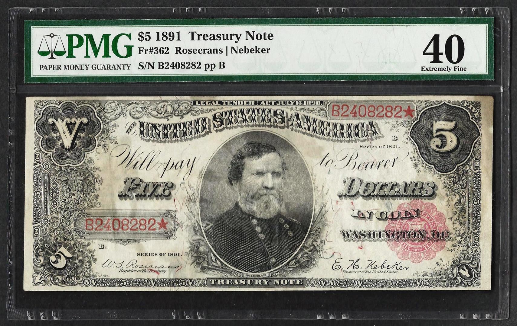One 1891 $5 Treasury Note Fr.362 PMG Extremely Fine 40. PMG Certified.