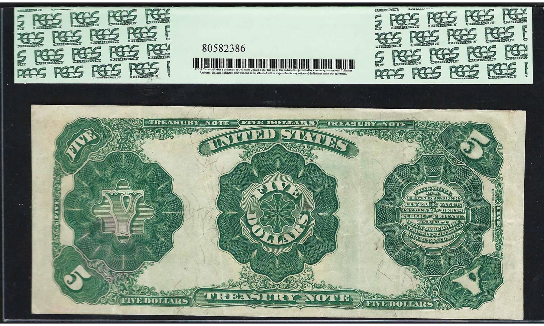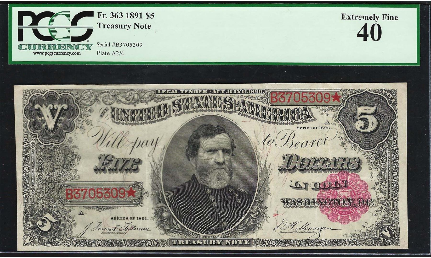 One 1891 $5 Treasury Note Fr.363 PCGS Extremely Fine 40. PCGS Graded.