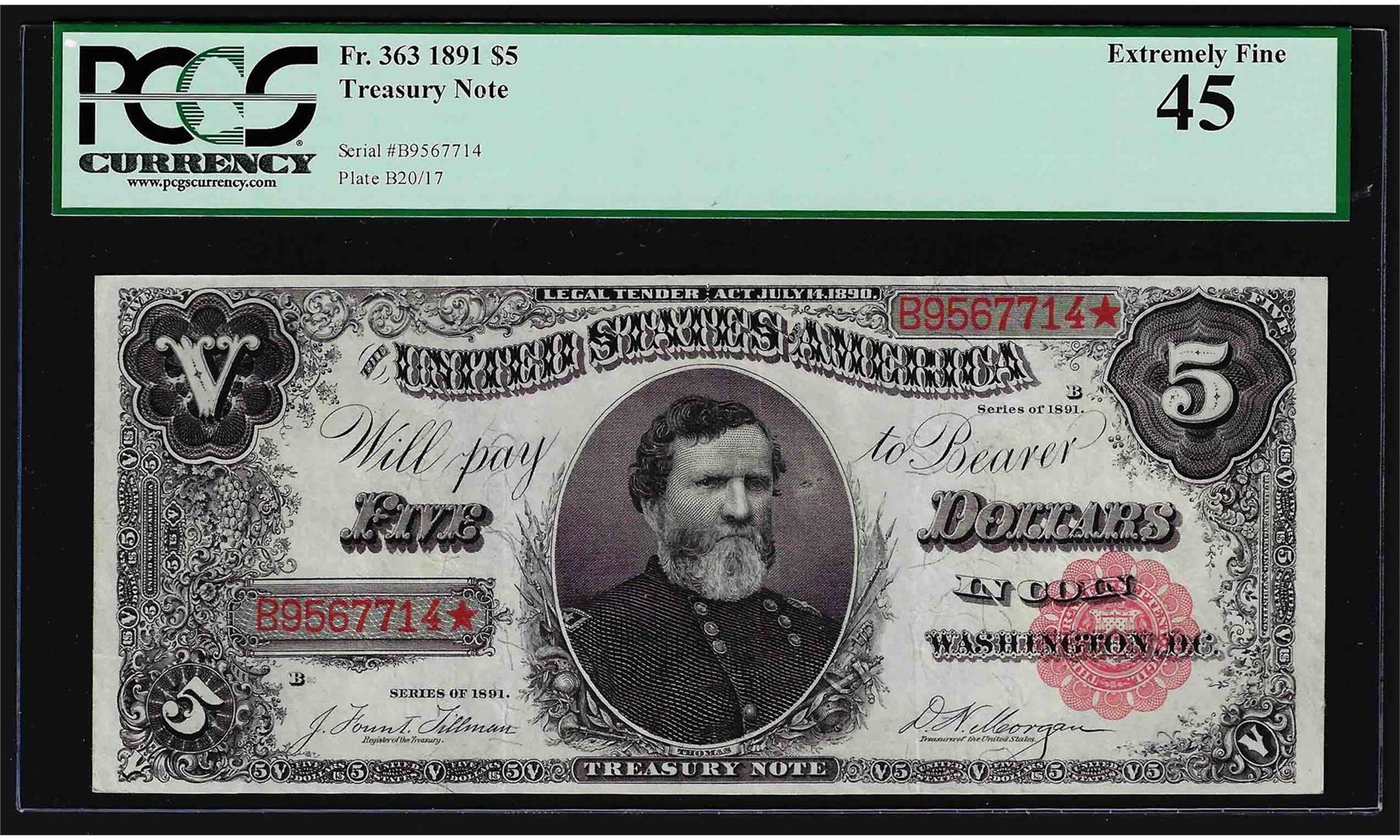 One 1891 $5 Treasury Note Fr. 363 PCGS Extremely Fine 45. PCGS Graded.