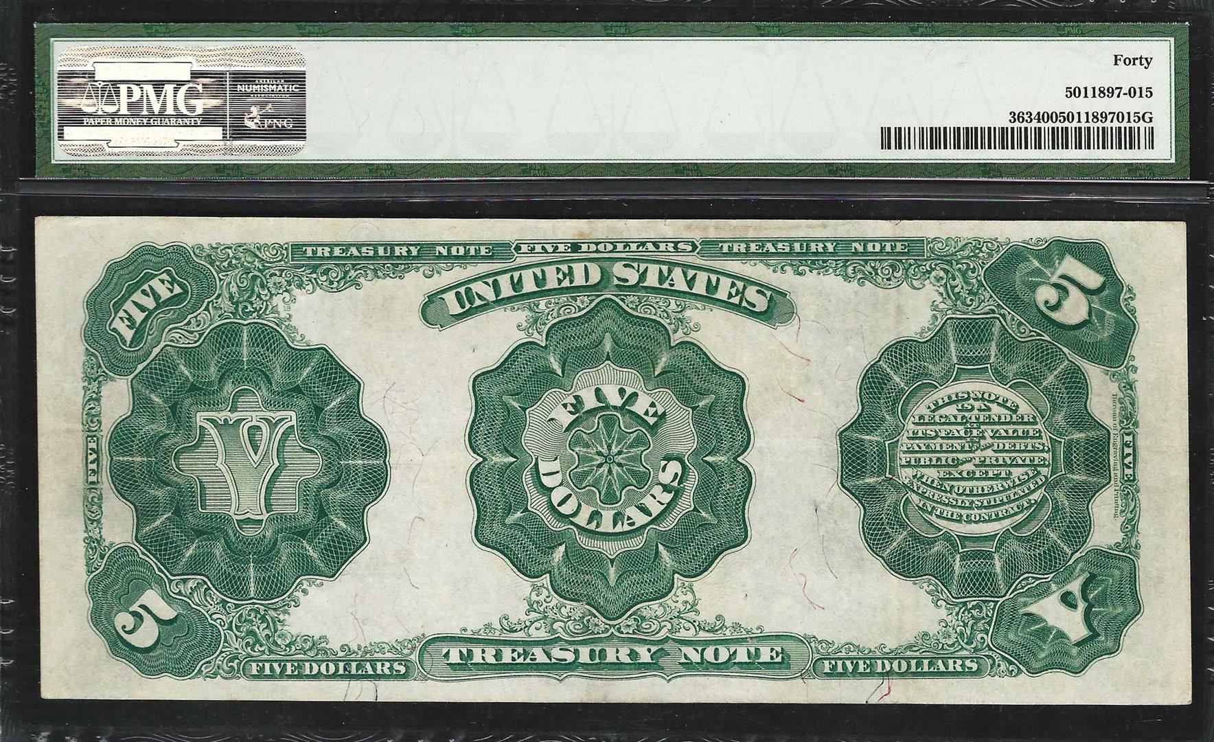 One 1891 $5 Treasury Note Fr.363 PMG Extremely Fine 40. PMG Certified.