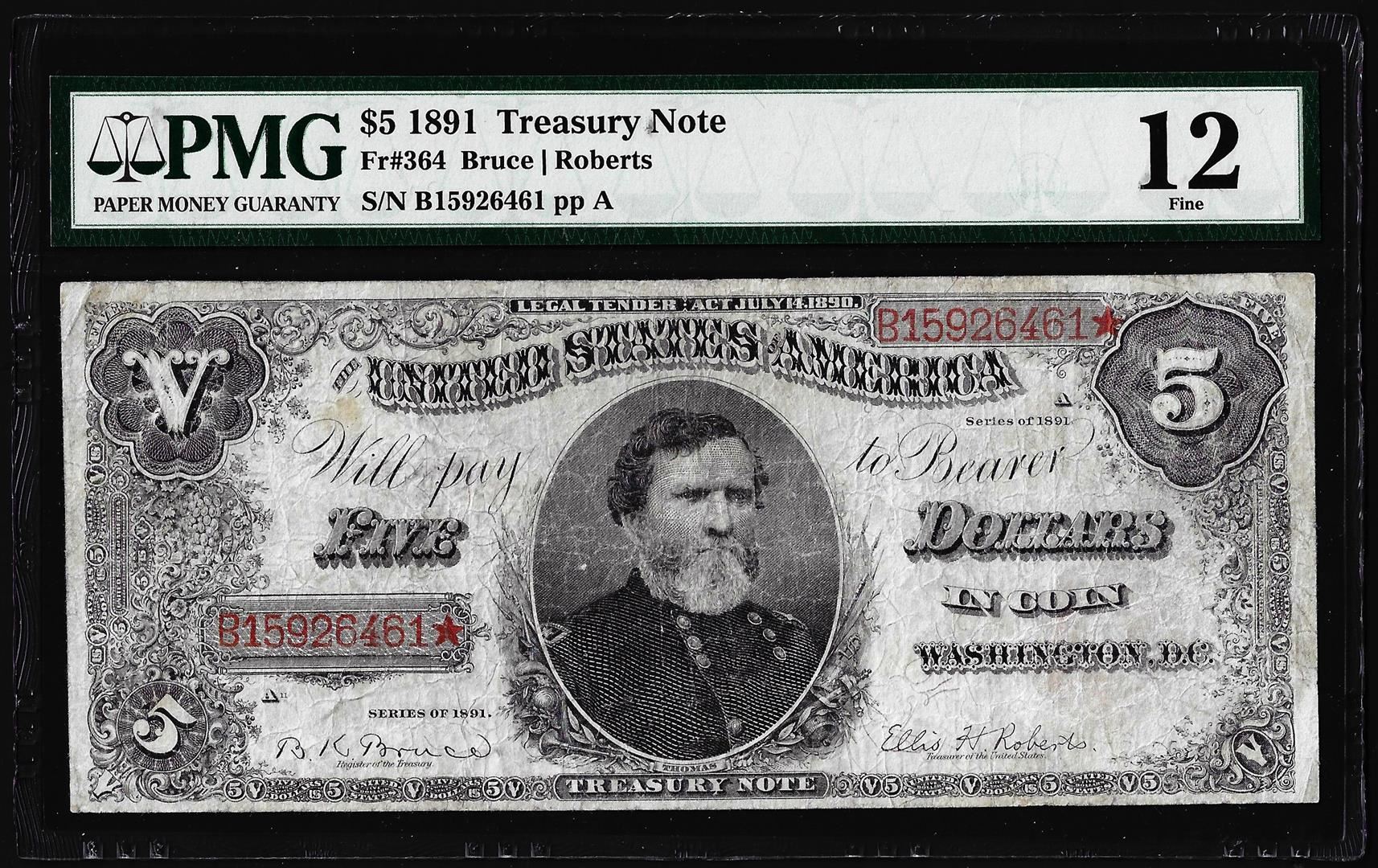 One 1891 $5 Treasury Note Fr.364 PMG Fine 12. PMG Certified.