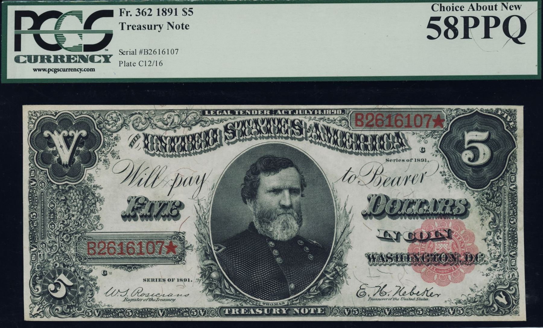 One 1891 $5 Treasury Note PCGS 58PPQ.