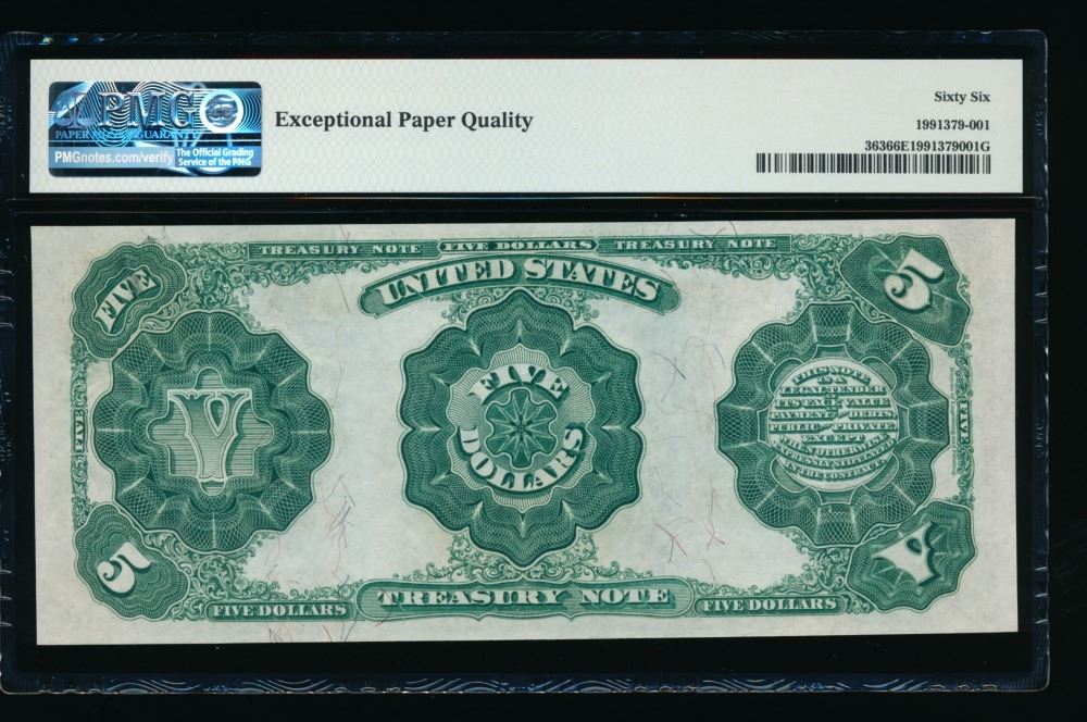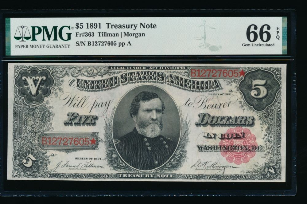 One 1891 $5 Treasury Note PMG 66EPQ.